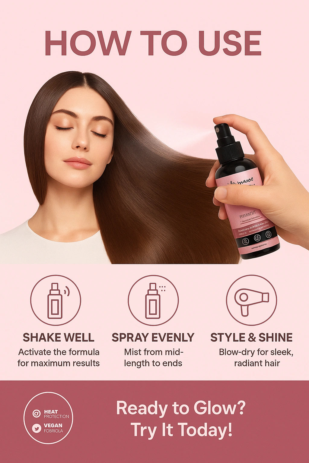 Spray evenly on damp or dry hair before using any heat styling tools. Do not rinse. Style as desired.